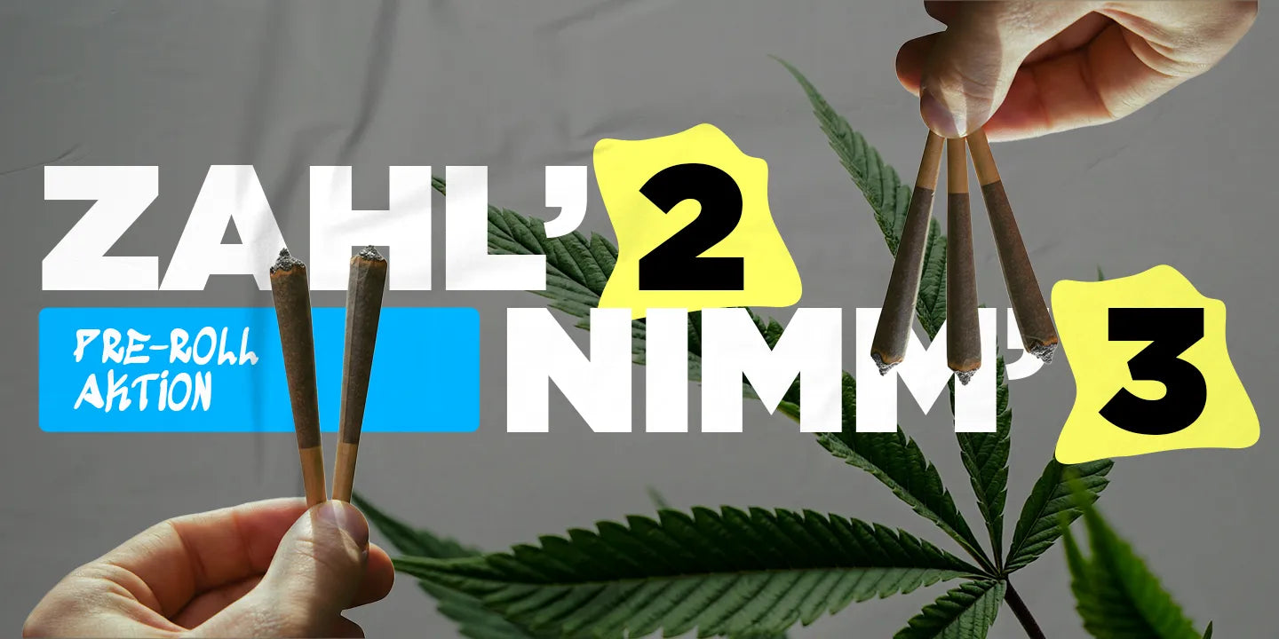 Füge zwei Pre-Rolls (2g) deinem Warenkorb. Danach erscheint ein Pop-Up mit deiner Geschenk-Auswahl (CBD oder H2) für deinen Gratis-Pre-Roll.